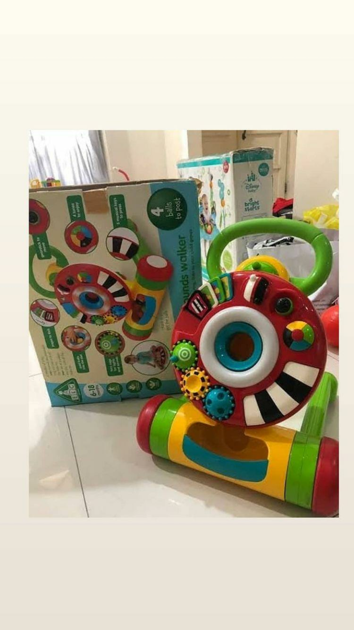 ELC Light & Sound Walker. Push walker ini akan membantu si kecil mulai dari duduk, berdiri dan mulai berjalan, serta dilengkapi dengan papan bermain berbentuk bulat yang dapat dipasang dan dilepaskan. Papan bermain dilengkapi dengan roda gerigi yang dapat diputar, mainan berbentuk kartu yang dapat dibalik, lubang pada bagian tengah yang dapat dimasukkan oleh bola-bola yang akan menghasilkan suara dan lampu warna-warni yang berkelap-kelip serta tuts piano yang dapat ditekan dan menghasilakan suara. Cocok untuk bayi usia 8 -24 bulan.